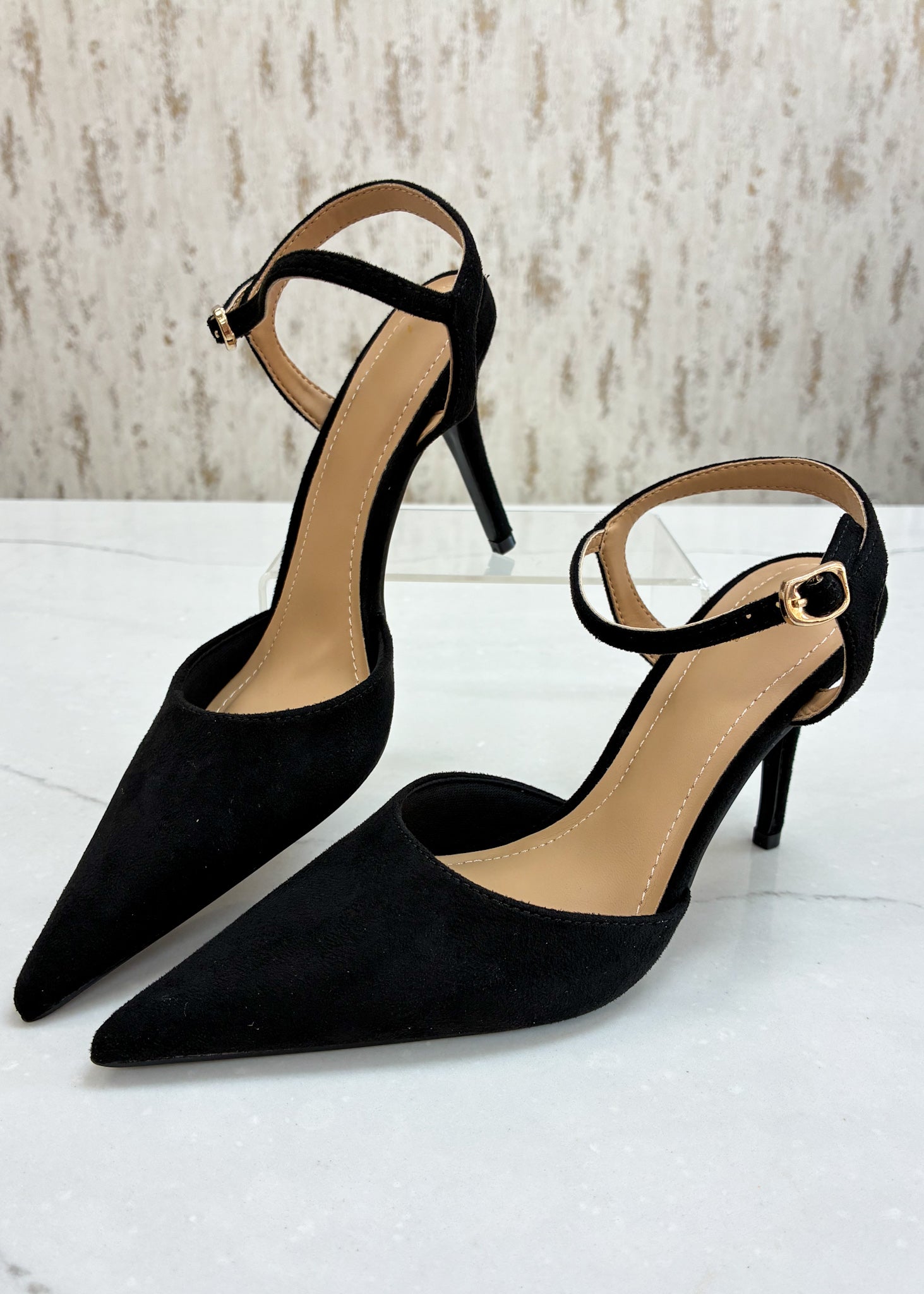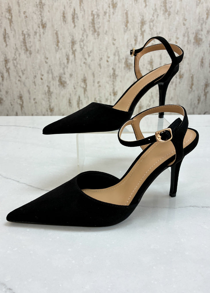- Black suede pointed-toe heel
